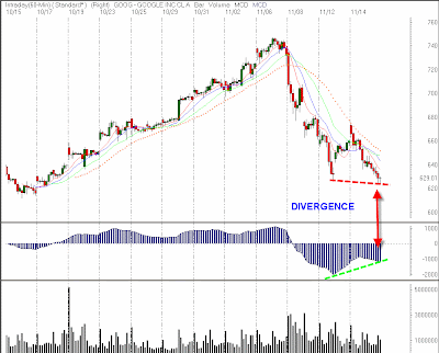 The MACD shows the difference between two exponential moving averages, I don’t use a “signal line” when I look at this indicator, just look at the oscillator. Yesterday I thought that as Google Inc. (Public, NASDAQ:GOOG) approached the rising 50 day moving average and the 50% rtracement level there was the potential for support in that area. The short term trend remains lower, however the hourly chart shown below is showing us signs of a potential turn. I stress that there is not proper stability on the shorter term trend to make a buy with confidence, but the MACD divergence is often one of the first signs that a stock is setting up for a tradable reversal that could last a couple of days. The lower low that GOOG made yesterday came on less volume and the selling was less intense than what the stock experienced on Tuesday (evidenced by the higher MACD level). The action on the daily timeframe (pullback to 50 dma & 50% retracement) leads us to drill down to the hourly timeframe where we see the MACD divergence which is a sign that sellers are less aggressive. Now for a low risk setup to materialize in shares of GOOG we need to take our analysis to shorter term timeframes to look for evidence that buyers are starting to become more aggessive and that they can take control.