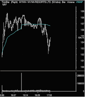 Shares of Wynn Resorts (WYNN) finished the regular session at $101.85 which was down $0.67. After the close the company reported earnings and the stock finished the extended session at $104.75 but as the chart shows, not everyone who bought after the close made money. In fact, the average price that shares of WYNN traded at in the after hours session was $106.67 meaning that the sellers were in control of the session. Notice how the VWAP moving average (light blue line) acted as resistance once the stock broke through it to the downside and the VWAP line was declining. I sold the stock short at a price of 106.70 at 4:58 PM and covered at 5:09 PM with a gain of $0.70 per share, clearly (in perfect hindsight) I didn’t hold long enough, I rarely do though. For more detailed information on trading after hours join me tomorrow in a free online session being hosted by Terra Nova Trading HERE The session will begin at 4:15 PM Est and conlude at approximately 5:00 PM, space is limited.