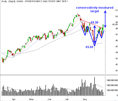 The Nasdaq 100 is clearly stronger than the SPY right now as the Qs have broken past the neckline of the pattern I began to outline in my videos on Tuesday. Using the measured move (and measuring it very conservatively) the upward target for the Qs would be approximately 51.00. As I always warn, do not use an upside target like this blindly, instead manage your positions by raising stops. Price targets merely give us a potential of where the market can go. I think a move back below 47.50 would invalidate this pattern.