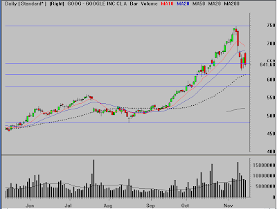 stocks on a relative basis yesterday was Google Inc (GOOG). That is not a good sign for the rest of the market. When the institutions go to their best stocks to raise cash it shows a need to liquidate. That need for liquidity could be based on anything, I still think we will be hearing some “news” to explain the overall weakness. Maybe there is another big hedge fund in trouble? Something doesn’t seem right…actually a lot doesn’t seem right if you are a bull. It’s nice to be a trader and just take advantage of the emotional moves. I would not be surprised to see GOOG make a lower low very near term, maybe even today. A 50% retrace of the August low to the recent high lines up almost perfectly with the rising 50 DMA near 615, but I would not suggest buying there if looking to enter. That is an area to watch for potential support and then switch to shorter term timeframes for evidence that buyers are gaining control. One thing to look for on the hourly chart is a MACD divergence to setup, as they ogen lead to reversals. If unfamiliar with this approach, check the “MACD Video” under Popular Posts on the right hand side of this blog. DEFENSE WINS THE GAME!