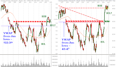 The markets continue to hold the gains with the SPY above the declining 50DMA for the second day. Volume is light once again, but that is not a reason to sell, only price pays.