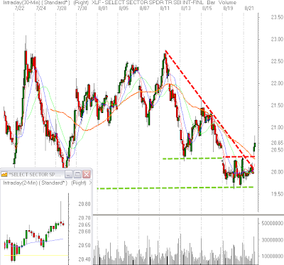 gapped higher at the open and overcame the recent resistance at 20.30. These stocks have shown a short term pattern of higher highs and higher lows today (see inset). With the inability of the market to break down below the important support at 19.75 it now seems as though the shorts may see more pressure. 20.30 should now become support, failure to do so would put this move in jeopardy.
