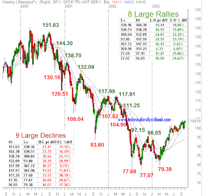 Notice the DIRECTION of the 200 day (40 week) MA, it did not turn higher until April/May 2003. As long as the 200 DMA is declining all rallies should be expected to fail.