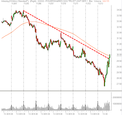 The Qs have rallied up above the trendline and are now battling the 5DMA. Daily R2 is just above at approx 30.20 You never know if the market has really turned, but if long your job is easy, manage risk!