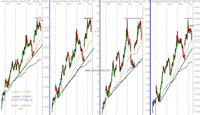 The charts below are 20 minute candles with the VWAP since the 3/10 move began (purple MA), the 5 DMA (orange). The 5 day MA’s are still advancing as is the average price since the rally began so it is still too early to look for a complete failure. These moving averages and the trendlines will be important areas to watch for potential support to emerge from as it looks like the market may be at the beginning of a more meaningful pullback with the short term lower highs and lower lows.