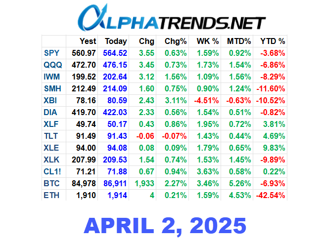 Wednesday, April 2 – Another volatile day with all major indexes closing above the 5-day moving average, but those MAs are still declining, so caution remains key. We’re sitting just under major anchors (last week's gap, recent highs), and with a key news event after the close, expect potential for a sharp move either direction. I'm mostly in cash—missed money is better than lost money. Tesla, Russell, and even biotechs are bouncing, but these are all happening within broader downtrends, so they're day-trade only for now. Financials may be invalidating the head-and-shoulders, while energy names are showing constructive follow-through. Palantir is choppy but holding key levels; still not touching it personally. Nvidia’s bounce is weak—ideally it pulls back, then maybe sets up. Bottom line: there’s progress, but we’re not in a swing-friendly market yet.